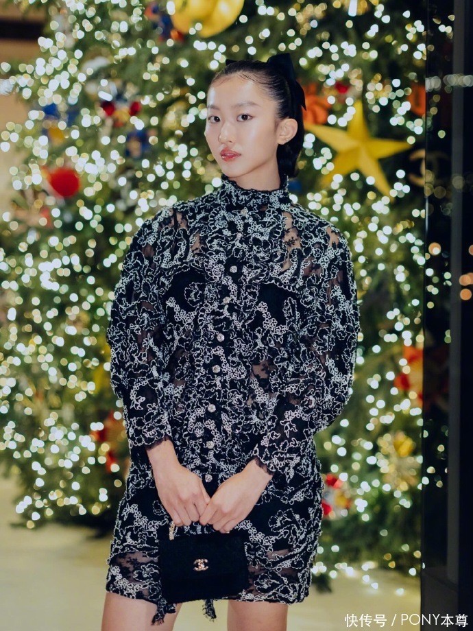 与母亲的成熟摩登不同,女儿陈康堤则以一身黑白山茶花刺绣短连衣裙,展现出青春少女的俏皮与灵动。黑白配色,经典而永恒,如同时尚界的基石,无论何时都不会过时。山茶花刺绣,作为香奈儿的标志性元素之一,为这条短裙增添了一份优雅与浪漫。精致的刺绣工艺,将山茶花的形态栩栩如生地呈现在裙摆上,仿佛每一朵花都在诉说着时尚的故事。
